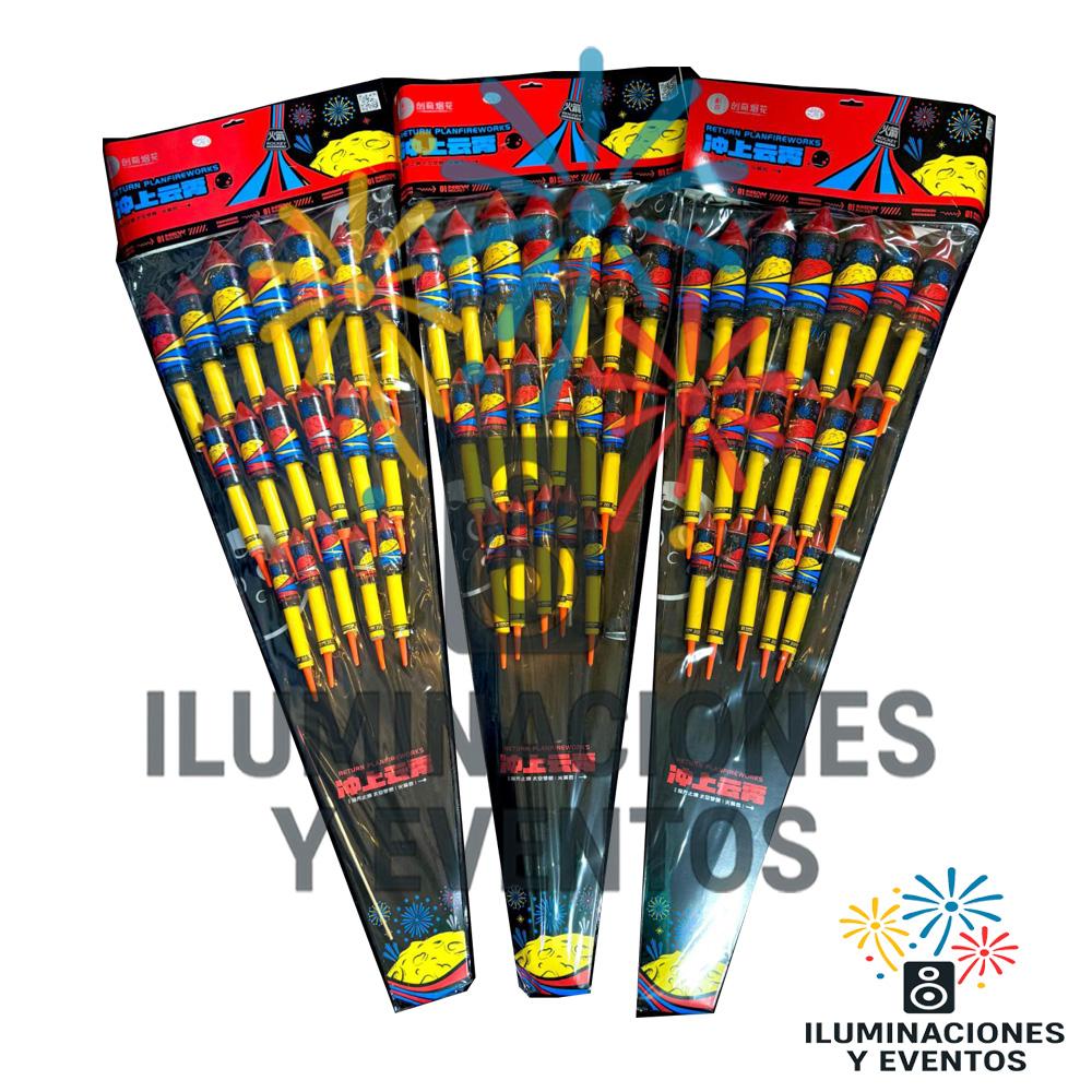 - Prohibido activar fuegos artificiales de espacio abierto en lugares cerrados o con techo, debajo de arboles, o próximos a otros elementos que pudieran incinerarse.